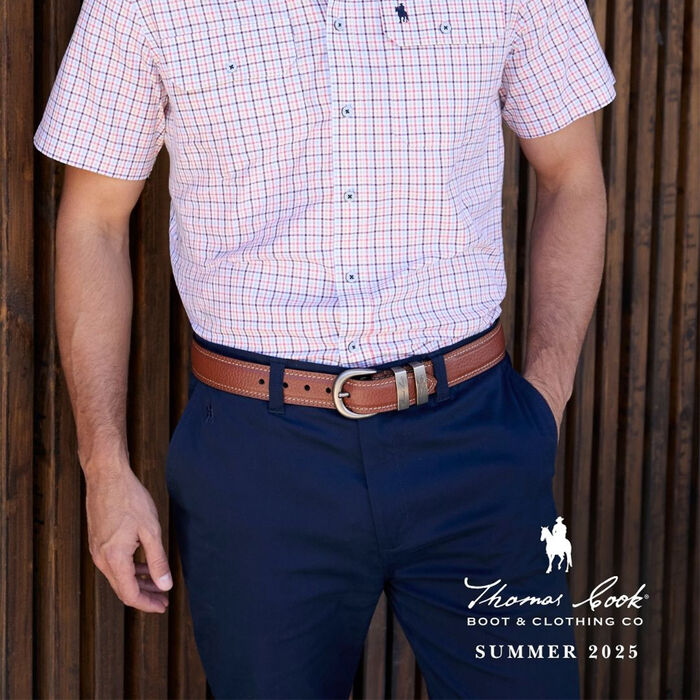 Metal buckle, embossed logo twin keepers, contrast edge stitch