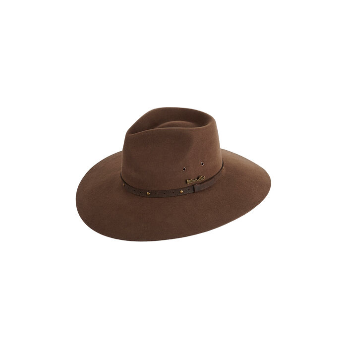 Hatband with studs, eyelets for breathability, fully lined crown, leather sweatband, showerproof, Thomas Cook metal logo pin. Detachable feather.