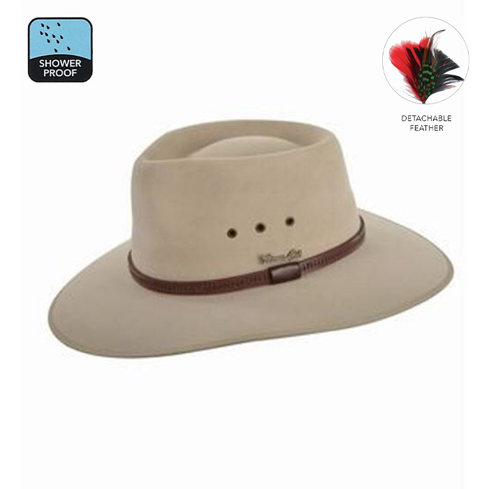 Premium pure rabbit fur felt, detachable feather, fully lined crown, brass eyelets for breathability, leather sweatband, showerproof, Thomas Cook metal logo pin