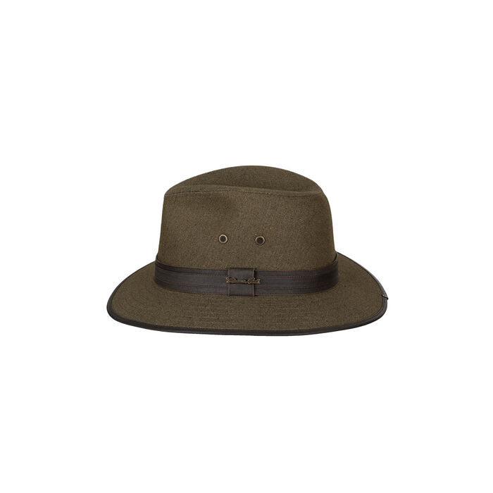 Contrast hatband, metal eyelets for breathability, lined crown, showerproof, Thomas Cook metal logo pin
